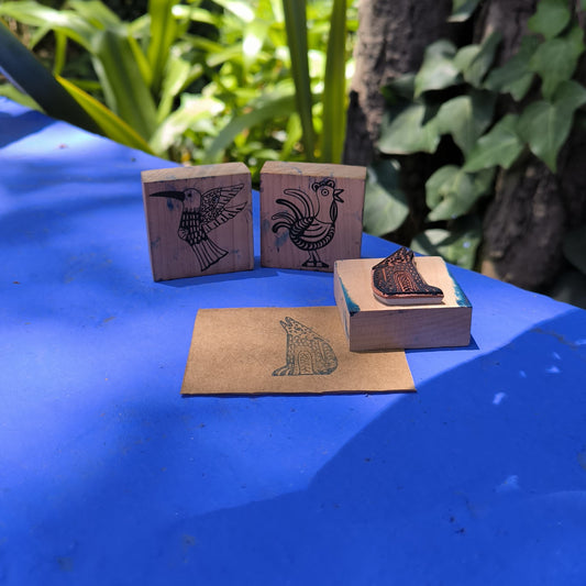 Kit de 4 sellos de goma /armadillo, coyote, guajolote y quetzal
